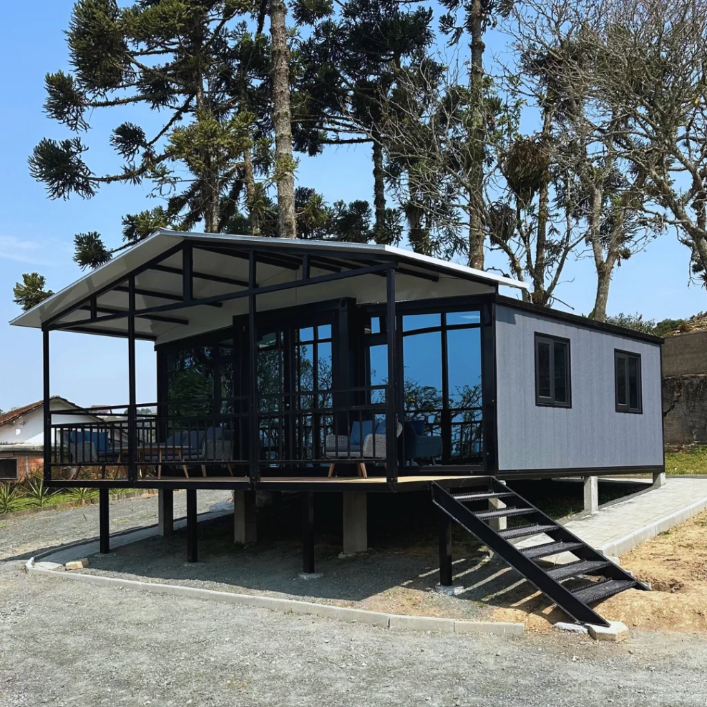 - Paredes: painel sanduíche galvanizado (EPS 50mm), acabamento interno em bambu e externo em chapa galvanizada cor madeira ou telha shingle.